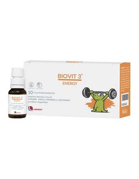 Descrizione Biovit 3 Energy è utile nei casi di aumentato fabbisogno di vitamine, zinco e aminoacidi quali: L-arginina e L-glutamina, con miele e pappa reale.