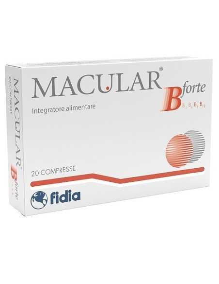 Integratore alimentare a base di vitamina E, zinco, rame, selenio, luteina e zeaxantina (da Tegetes erecta L.), vitamine B2, B6, B12, acido folico e Ginkgo biloba, suggerito nel caso di aumentato fabbisogno o di diminuito apporto con la dieta dei nutrienti che lo compongono. Le sostanze contenuto in MACULAR B forte contribuiscono: al mantenimento della capacità visiva normale (zinco, vitamina B2); a proteggere le cellule dallo stress ossidativo (zinco, vitamina B2, rame, vitamina E, selenio, Ginkgo biloba estratto); al normale funzionamento del sistema nervoso (vitamina B2, rame, vitamina B6, vitamina B12); al normale metabolismo dell’omocisteina (vitamina B6, acido folico, vitamina B12); al normale metabolismo delle proteine e del glicogeno (vitamina B6); al mantenimento della normale circolazione del sangue e funzionalità del microcircolo (Ginkgo biloba estratto).