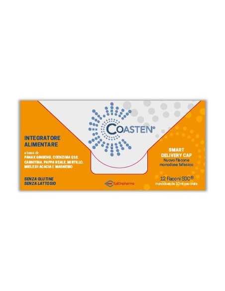 Coasten in flaconi per uso orale è un integratore alimentare a base di panax ginseng, coenzima Q10, carnitina, pappa reale, mirtillo, miele di acacia e magnesio, utile per colmare le carenze alimentari o gli aumentati fabbisogni di tali nutrienti.