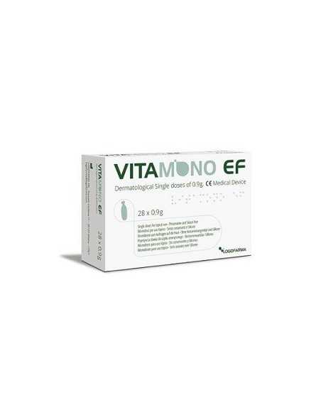 VITAMONO EF è un Dispositivo Medico per uso cutaneo a base di vitamina E, vitamina F e Taurina. VITAMONO EF si presenta come lipogel anidro ed è indicato per la stabilizzazione e il ripristino della funzione fisiologica della barriera lipidica cutanea superficiale. La vitamina E in forma libera (non esterificata) comprende due classi di composti: i Tocoferoli e i Tocotrienoli, di cui, questi ultimi, sono presenti in concentrazione più elevata nel dispositivo VITAMONO EF. I Tocotrienoli, presenti quindi sul film lipidico che si forma attraverso l’applicazione di VITAMONO EF sulla superficie della cute integra, favoriscono le difese fisiologiche naturali dei tessuti cutanei nei confronti degli insulti provocati da agenti esterni quali raggi solari, foto danneggiamento, aggressione da agenti chimici e inquinamento e facilitano i processi riparativi. Consentono quindi la prevenzioni delle alterazioni cutanee e dei danni ossidativi coadiuvando il trattamento della sintomatologia associata a stati infiammatori della cute e delle mucose. La vitamina F (acidi grassi essenziali Omega 3 ed Omega 6) fornisce un apporto fisiologico di costituenti essenziali della membrana cellulare, potenziando così l’azione protettiva del film cutaneo di superficie e favorendo, di conseguenza, una corretta cheratinizzazione cutanea. La Taurina svolge un ruolo importante nella foto protezione in particolare nei confronti dei danni ossidativi al collagene e, in combinazione con la vitamina E, è importante nel mantenimento della funzione della barriera cutanea. In VITAMONO EF è presente anche il Sincrofill, componente non siliconico che garantisce stabilità alla vitamina E in forma libera e, grazie all’assenza di acqua, permette il confezionamento e l’utilizzo del prodotto in monodosi, totalmente biodegradabili e compostabili. Poiché non contiene coloranti, conservanti e profumi, e in relazione alla sua elevata biocompatibilità, VITAMONO EF garantisce un’ottima tollerabilità su pelli sensibili e grazie all'assenza di siliconi e sostanze a nota capacità sensibilizzante può essere applicato anche sul contorno occhi.