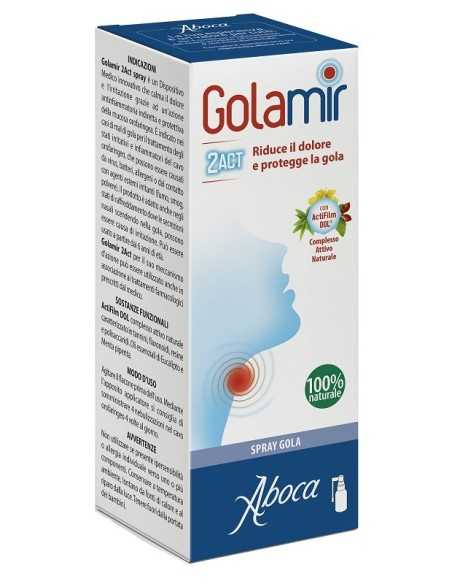 Golamir 2 Act spray, grazie al suo complesso attivo naturale Actifilm DOL agisce su dolore, bruciore e difficoltà di deglutizione proteggendo la mucosa dai fattori scatenanti l'irritazione.
