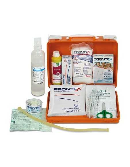 Cassetta in materiale plastico. Completa del contenuto prescritto dalla normativa vigente in materia di sicurezza sui posti di lavoro. Dotata di struttura per il fissaggio a muro. Staccabile per il trasporto sul luogo dell'infortunio.