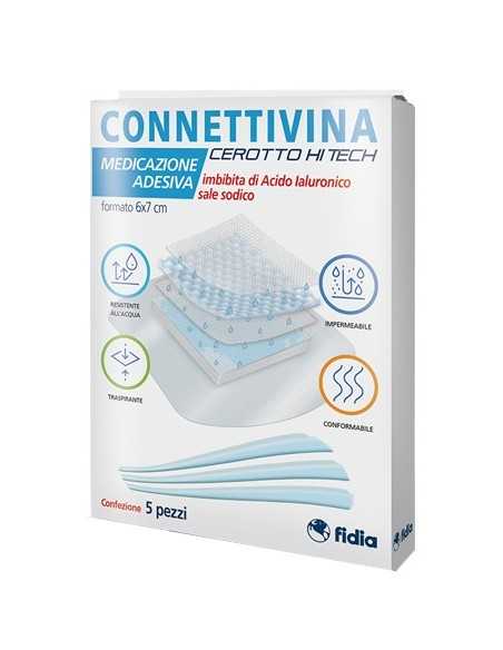 Connettivina cerotto Hi Tech è un dispositivo medico per uso cutaneo costituito da un bordo adesivo trasparente in poliuretano e un tampone centrale assorbente multistrato imbibito di una soluzione di acido ialuronico sale sodico allo 0,3%.