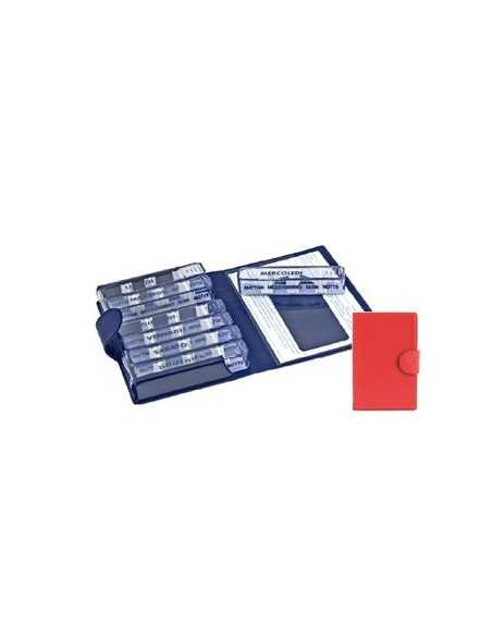 Pratico astuccio settimanale contenente 7 portapillole giornalieri, ciascuno dei quali munito di 3 pareti interne regolabili (4 spazi) per: mattino, mezzogiorno, sera, notte.