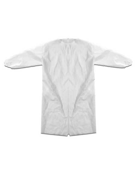 Camice in tessuto non tessuto, TNT da 30 g uso generico idrorepellente e traspirante. Materiale 100% polipropilene, Unisex TG. Unica; semicirconferenza torace 68 cm; lunghezza da spalla davanti 111 cm; elastico ai polsi, colore bianco. Da smaltire secondo la normativa vigente. Può essere incenerito senza formazione di residui tossici.