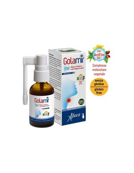 Golamir 2 Act spray, grazie al suo complesso attivo naturale Actifilm DOL agisce su dolore, bruciore e difficoltà di deglutizione proteggendo la mucosa dai fattori scatenanti l'irritazione.