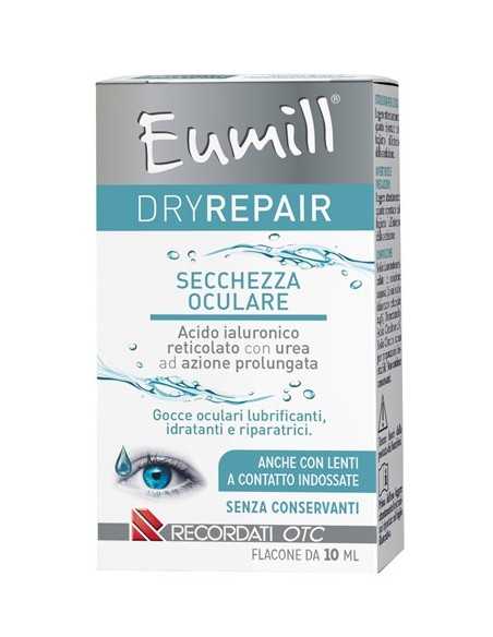Soluzione sterile per uso oftalmico a pH fisiologico a base di acido ialuronico reticolato con urea, secondo una tecnologia brevettata, così da aumentare e migliorare le naturali proprietà meccaniche dell'acido ialuronico, rendendolo in grado di resistere più a lungo alla degradazione da parte delle ialuronidasi rispetto all'acido ialuronico naturale. La struttura reticolata che l'acido ialuronico forma offre idratazione ed è in grado di trattenere a lungo le molecole di acqua in modo da migliorare le intrinseche proprietà lubrificanti dell'acido ialuronico mentre, aumentando al contempo la sua azione idratante, è indicato come adiuvante nella sindrome dell'occhio secco. L'acido ialuronico reticolato è inoltre efficace nel contrastare radicali liberi e nell'esercitare un'azione riepitelizzante per una maggiore protezione della superficie corneale. L'acido ialuronico reticolato conferisce al prodotto proprietà lubrificanti, idratanti e riparatrici; è inoltre in grado di alleviare la secchezza oculare dovuta alla sindrome dell'occhio secco e donare sollievo in caso di stanchezza o irritazione oculare determinata da processi infiammatori o condizioni ambientali. Eumill DryRepair allevia rossore, secchezza, fatica e discomfort oculare causati da sindrome dell'occhio secco, fattori ambientali come vento, fumo, inquinamento, prolungata esposizione alla luce solare, salsedine, acqua di mare o piscina, studio o lavoro intensi, prolungato utilizzo del computer, lunghi periodi di guida, problematiche di lacrimazione generate da processi infiammatori, chirurgia oculare o chirurgia estetica palpebrale e blefariti croniche. Idrata e lubrifica la cornea e la congiuntiva in caso di secchezza oculare dovuta all'uso di lenti a contatto. Questa formula è stata sviluppata per donare il massimo comfort già dai primi istanti dopo l'applicazione. È indicata per un utilizzo quotidiano sia diurno che notturno. Non contiene conservanti e/o molecole ad azione anti-infiammatoria o vaso-costrittrice.