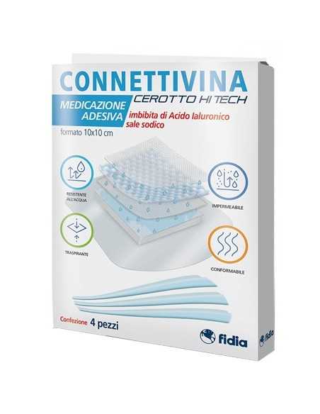 Connettivina cerotto Hi Tech è un dispositivo medico per uso cutaneo costituito da un bordo adesivo trasparente in poliuretano e un tampone centrale assorbente multistrato imbibito di una soluzione di acido ialuronico sale sodico allo 0,3%.