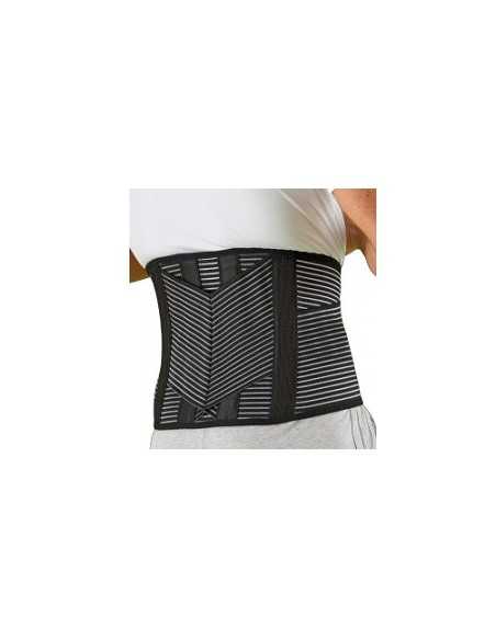 Sostegno rigido con steccaggio e concentrazione delle forze sulla regione lombare ottenuta dal sistema di fasce a V.