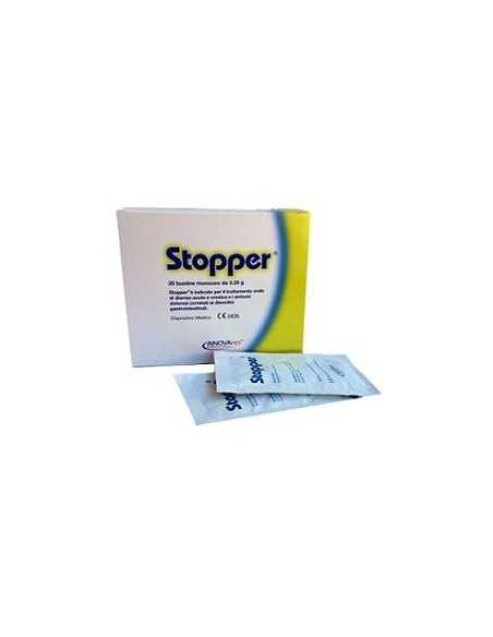 Dispositivo medico CE 0426, classe IIa. Stopper è efficacemente impiegato in caso di accelerato transito intestinale (diarrea acuta e cronica), in presenza di ileostomia o di ileoanoanastomosi o negli esiti della chirurgia dell’apparato digerente, compresa la chirurgia dell’obesità, in caso di alvo diarroico da intestino irritabile, in caso di “diarrea del viaggiatore” o per migliorare la continenza fecale in presenza di alvo fluido. Gusto limone.
