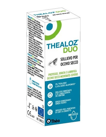 THEALOZ DUO è raccomandato in caso di fastidio, sensazione pungente, di corpo estraneo o irritazione degli occhi dovuta a secchezza oculare da moderata a grave. Tali sintomi possono essere causati per esempio da fattori esterni come vento, fumo, inquinamento, polvere, esposizione al sole o al freddo, caldo secco, aria condizionata, viaggi in aereo e molte ore trascorse davanti allo schermo del computer. THEALOZ DUO dà sollievo immediato dai sintomi dell’occhio secco, che dura tutto il giorno. THEALOZ DUO è ben tollerato sulla superficie oculare e può essere usato dai portatori di lenti a contatto, indipendentemente dal tipo di lenti. Gli ingredient principali di THEALOZ DUO sono trealosio e ialuronato sodico. Il trealosio è una sostanza naturale presente in molte piante e animali, che può sopravvivere in condizioni di estrema secchezza. Fornisce proprietà protettive e idratanti. Lo ialuronato sodico, presente nell’occhio umano, trattiene l’acqua per idratare e lubrificare la superficie dell’occhio. Mantiene la soluzione sulla superficie dell’occhio, dando sollievo a lungo e accorciando i tempi di guarigione dell’epitelio corneale. Grazie all’abbinamento di trealosio e ialuronato sodico, THEALOZ DUO offre protezione, idratazione e lubrificazione a lungo termine della superficie dell’occhio.