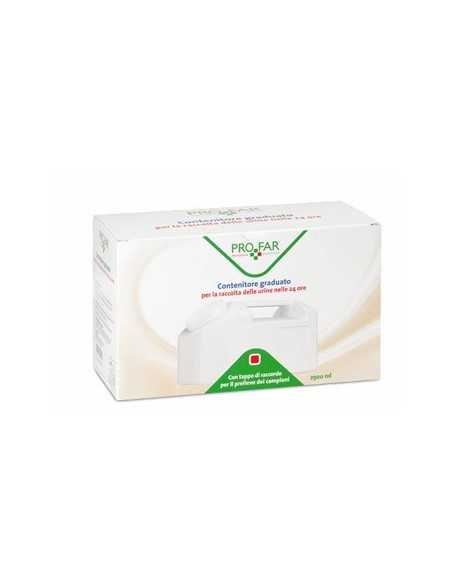 Contenitore graduato per la raccolta delle urine nelle 24 ore, con tappo di raccordo per il prelievo dei campioni e istruzioni dettagliate sulle modalità di conservazione del campione.