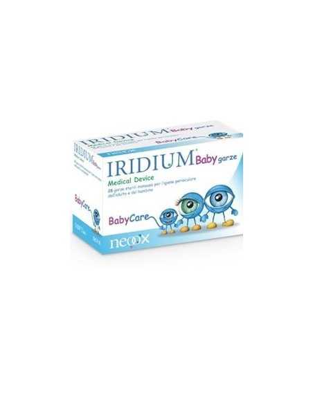 Dispositivo medico CE 0546. Garza di cotone naturale imbevuta di una soluzione di estratti vegetali (Echinacea angustifolia, Ananas sativus, Ammonio glicirizzato) in grado di svolgere un'attività detergente, emolliente, lenitiva e decongestionante. Iridium baby garze è indicato per l'igiene oculare sia quotidiana che in presenza di stati infettivi e/o infiammatori.Modalità d'utilizzo