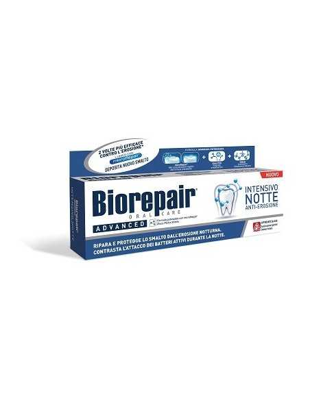 La formula avanzata Biorepair Intensivo Notte Anti-Erosione è potenziata per contrastare il processo di demineralizzazione dello smalto dei denti che avviene durante la notte. I microRepair, presenti in alta concentrazione, si depositano sullo smalto riparandolo e proteggendo la superficie dei denti dall'erosione notturna. Zinco, PCA e xilitolo contrastano insieme l'attività aggressiva degli acidi dei batteri, principale causa di demineralizzazione, placca, tartaro e carie. Inoltre lo speciale aroma stimola il flusso salivare notturno per una protezione naturale dello smalto e un alito più fresco al risveglio.