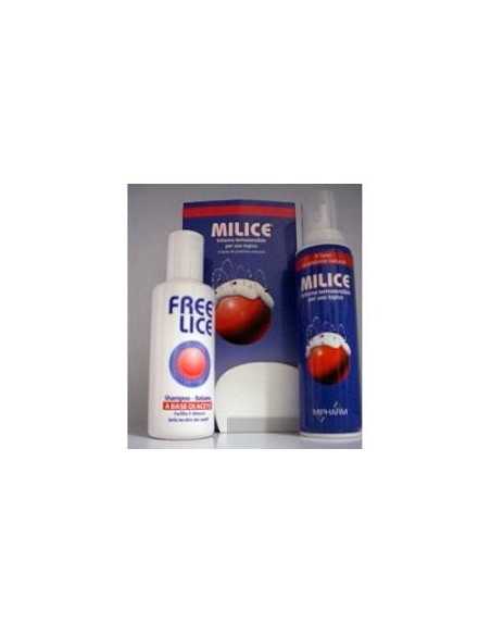 Trattamento anti pidocchi composto da schiuma e shampoo.- Milice schiuma: a base di pietrine naturali, è una formulazione topica con innovativa tecnologia di somministrazione, efficace contro uova e pidocchi. Schiuma comoda da applicare e ben accetta anche a bambini e ragazzi. Distribuita sulla zona e lievemente massaggiata, assume immediatamente una consistenza liquida per effetto del calore corporeo; ciò permette ai suoi principi attivi di raggiungere ogni punto della zona interessata e permanere a contatto con gli agenti infestanti, esplicando una completa ed efficace azione anche sulle uova depositate lungo i capelli ed i peli. Lasciate agire Milice per almeno 10 minuti, quindi lavate la zona trattata con un normale shampoo, per rimuovere i residui inerti dei parassiti.