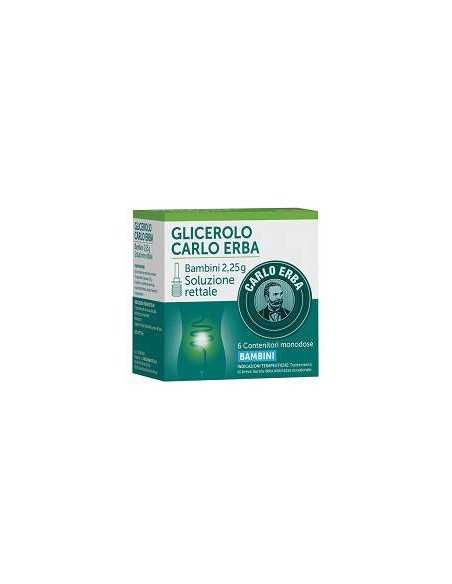GLICEROLO CARLO ERBA Prima infanzia 900 mg supposte Una supposta prima infanzia contiene: principio attivo: Glicerolo 900 mg. GLICEROLO CARLO ERBA Bambini 1375 mg supposte Una supposta bambini contiene: principio attivo: Glicerolo 1375 mg. GLICEROLO CARLO ERBA Adulti 2250 mg supposte Una supposta adulti contiene: principio attivo: Glicerolo 2250 mg. GLICEROLO CARLO ERBA Bambini 2,25 g soluzione rettale Ogni contenitore monodose contiene: principio attivo: Glicerolo 2,25 g. GLICEROLO CARLO ERBA Adulti 6,75 g soluzione rettale Ogni contenitore monodose contiene: principio attivo: Glicerolo 6,75 g. Per l’elenco completo degli eccipienti, vedere paragrafo 6.1.