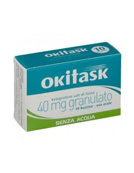 Posologia. Adulti e maggiori di 15 anni: la dose raccomandata è 40 mg (corrispondente a 1 bustina), in dose singola, o ripetuta 2-3 volte al giorno, nelle forme dolorose di maggiore intensità. Non superare le dosi raccomandate. Popolazioni particolari. Anziani: La posologia deve essere attentamente stabilita prendendo in considerazione un’eventuale riduzione dei dosaggi sopraindicati. Pazienti con insufficienza epatica o renale: Si raccomanda una terapia al dosaggio minimo giornaliero e un attento monitoraggio (vedere paragrafo 4.4). In caso di insufficienza renale si raccomanda di controllare il volume di diuresi e la funzionalità renale (vedere paragrafo 4.4). Okitask 40 mg granulato non deve essere utilizzato in pazienti con severe disfunzioni epatiche o renali (vedere paragrafo 4.3). Popolazione pediatrica: La sicurezza e l’efficacia di Okitask 40 mg granulato nei bambini non sono state ancora stabilite. Modo di somministrazione: Il contenuto della bustina può essere posto direttamente sulla lingua. Si dissolve con la saliva: questo ne consente l'impiego senza acqua. È preferibile assumere il prodotto a stomaco pieno. Durata di trattamento: La durata della terapia dovrà essere limitata al superamento dell'episodio doloroso. La dose efficace più bassa deve essere usata per il periodo più breve necessario ad alleviare i sintomi (vedere paragrafo 4.4).