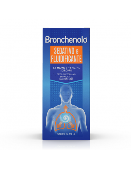 Nei seguenti casi BRONCHENOLO SEDATIVO E FLUIDIFICANTE deve essere utilizzato solo dopo attenta valutazione medica: - tosse cronica o persistente, come quella che si manifesta in caso di asma o enfisema; - grave insufficienza epatica; - grave insufficienza renale; - uso concomitante di antidepressivi inibitori selettivi del re-uptake della serotonina o di antidepressivi triciclici (vedere paragrafo 4.5). Il paziente deve essere informato di consultare il medico se la tosse persiste, o se è accompagnata da febbre alta, rash cutaneo o mal di testa persistente. Non superare la massima dose raccomandata o la frequenza di somministrazione. Dopo 5-7 giorni di trattamento senza risultati apprezzabili, è necessaria una valutazione clinica. Deve essere evitato l’uso contemporaneo di altri medicinali per la tosse e il raffreddore. Deve essere evitato l’uso concomitante di alcool durante la terapia con BRONCHENOLO SEDATIVO E FLUIDIFICANTE. Sono stati riportati casi di abuso e dipendenza di destrometorfano. Si raccomanda di prestare particolare attenzione con adolescenti e giovani adulti, nonché con pazienti con una storia di abuso di farmaci o sostanze psicoattive. Il destrometorfano è metabolizzato dal citocromo epatico P450 2D6. L’attività di questo enzima è geneticamente determinata. Circa il 10% della popolazione metabolizza lentamente il CYP2D6. In metabolizzatori lenti e pazienti con uso concomitante di inibitori del CYP2D6 possono manifestarsi effetti esagerati e/o prolungati del destrometorfano. È necessario pertanto prestare attenzione in pazienti metabolizzatori lenti del CYP2D6 o che utilizzano inibitori del CYP2D6 (vedere anche paragrafo 4.5). Rischi derivanti dall’uso concomitante di medicinali sedativi come le benzodiazepine o farmaci correlati. L’uso concomitante di BRONCHENOLO SEDATIVO E FLUIDIFICANTE e medicinali sedativi come le benzodiazepine, o farmaci correlati, può causare sedazione, depressione respiratoria, come e morte. A causa di questi rischi, la prescrizione concomitante con medicinali sedativi deve essere riservata ai pazienti per i quali non siano disponibili opzioni di trattamento alternative.Qualora BRONCHENOLO SEDATIVO E FLUIDIFICANTE fosse prescritto in concomitanza con medicinali sedativi, deve essere usata la dose efficace più bassa e la durata del trattamento deve essere la più breve possibile. I pazienti devono essere attentamente monitorati per segni e sintomi di depressione respiratoria e sedazione. A tale riguardo, si raccomanda fortemente di informare i pazienti e chiunque si prenda cura di loro al fine di renderli consapevoli di questi sintomi (vedere paragrafo 4.5). Sindrome da seratonina Effetti serotoninergici, incluso lo sviluppo di una sindrome da serotonina potenzialmente letale, sono stati segnalati per destrometorfano con somministrazione concomitante di agenti serotoninergici, come gli inibitori selettivi della ricaptazione della serotonina (selective serotonin reuptake inhibitors, SSRI), farmaci che alterano il metabolismo della serotonina (tra cui gli inibitori della monoammino-ossidasi [monoamine oxidase inhibitors, MAOI]) e gli inibitori del CYP2D6. La sindrome da serotonina può includere variazioni dello stato mentale, instabilità autonomica, anomalie neuromuscolari e/o sintomi gastrointestinali. Qualora si sospetti una sindrome da serotonina, il trattamento con BRONCHENOLO SEDATIVO E FLUIDIFICANTE dovrà essere interrotto. Popolazione pediatrica Nei bambini in caso di sovradosaggio possono verificarsi eventi avversi gravi, inclusi disturbi neurologici. Le persone che si prendono cura dei pazienti dovranno essere avvisate di non superare la dose raccomandata. Informazioni sugli eccipienti con effetti noti BRONCHENOLO SEDATIVO E FLUIDIFICANTE sciroppo contiene: • saccarosio. Contiene 7,35 g di saccarosio (zucchero) per una dose di 10 ml. Questo dovrebbe essere preso in considerazione in pazienti con diabete mellito. I pazienti affetti da rari problemi ereditari di intolleranza al fruttosio, da malassorbimento di glucosio-galattosio, o da insufficienza di sucrasi isomaltasi, non devono assumere questo medicinale; • alcol etilico. Questo medicinale contiene 480 mg di alcol (etanolo) in ogni dose di 10 ml. La quantità in 10 ml di questo medicinale è equivalente a 12 ml di birra e 5 ml di vino. Può essere dannoso per gli alcolisti. Da tenere in considerazione nelle donne in gravidanza o in allattamento, nei bambini e nei gruppi ad alto rischio come le persone affette da patologie epatiche o epilessia. Una dose di 10ml di questo medicinale somministrato ad un bambino di età pari a 12 anni e peso inferiore o uguale a 32kg comporterebbe un’esposizione di 15 mg che può causare un aumento della concentrazione di alcool nel sangue (BAC) di circa 2,5 mg/100ml. La co-somministrazione con medicinali contenenti per es. glicole propilenico o etanolo possono portare all'accumulo di etanolo e indurre effetti avversi, in particolare nei bambini piccoli con attività metabolica bassa o immatura. • propile e metile para-idrossibenzoati, che possono causare reazioni allergiche (anche ritardate); • Sodio. Questo medicinale contiene meno di 1 mmole di sodio (23 mg), cioè essenzialmente senza sodio. BRONCHENOLO SEDATIVO E FLUIDIFICANTE pastiglie gusto menta contiene: • saccarosio. contiene 2,08 g di saccarosio per dose. I pazienti affetti da rari problemi ereditari di intolleranza al fruttosio, da malassorbimento di glucosio-galattosio, o da insufficienza di sucrasi isomaltasi, non devono assumere questo medicinale; • aspartame. Questo medicinale contiene 23 mg di aspartame per compressa. Aspartame è una fonte di fenilalanina. Può esserle dannoso se è affetto da fenilchetonuria, una rara malattia genetica che causa l’accumulo di fenilalanina perché il corpo non riesce a smaltirla correttamente.